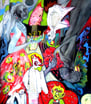 hat zwei handelnde Personen, einmal aufrecht stehend, einmal kopfüber hängend Dazwischen tummeln sich diverse Figuren wie z. B. der kleine giftig gelbe King of Eifersucht. Sie zeigen (für mich) die Irrationalität der Eifersucht.