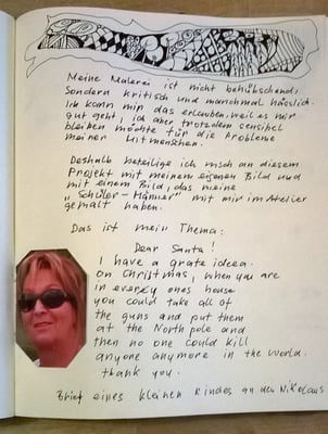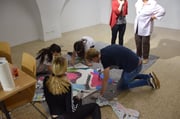 Nach der Grundierung wurden die einzelnen Beiträge besprochen und skizziert. Bei mir arbeiteten drei Mädchen und ein Junge. Nach anfänglicher Unsicherheit schafften die Schüler es, unser Bild, bis auf die kurzen Texte, in 4 Stunden fertigzustellen. Die einzelnen Kommentare wurden dann im Kunsterziehungs-Unterricht eingefügt. Auf jeden Fall kann ich sagen, dass es ein sehr produktiver Vormittag in der Kunsthalle Leoben war.