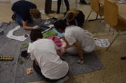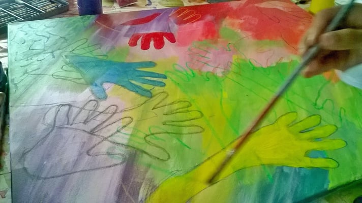 Jeweilsl 4 Schüler brachten ihre eigenen Ideen zum Thema Migration ein und gestalteten ein Bild für das Projekt *See the big picture* von Desmond Doyle. Zuerst mußten auf der 100x80 Leinwand die verfügbaren Flächen aufgeteit werden. Wir machten das mit Papierflächen, die von den Schülern selbst entworfen wurden.